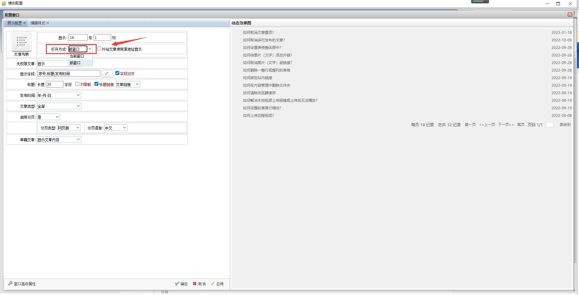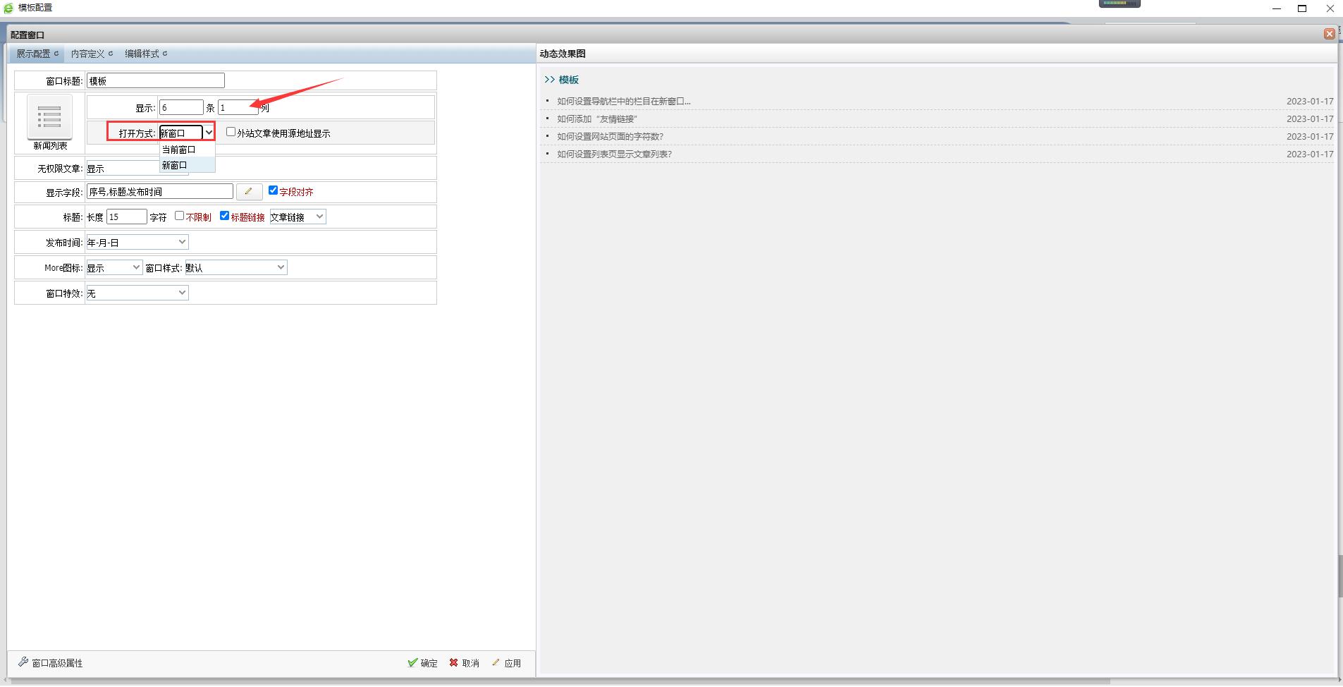 在首页模板main.htm配置中,打开各个模块的配置页面,展示配置中的打开方式选择“