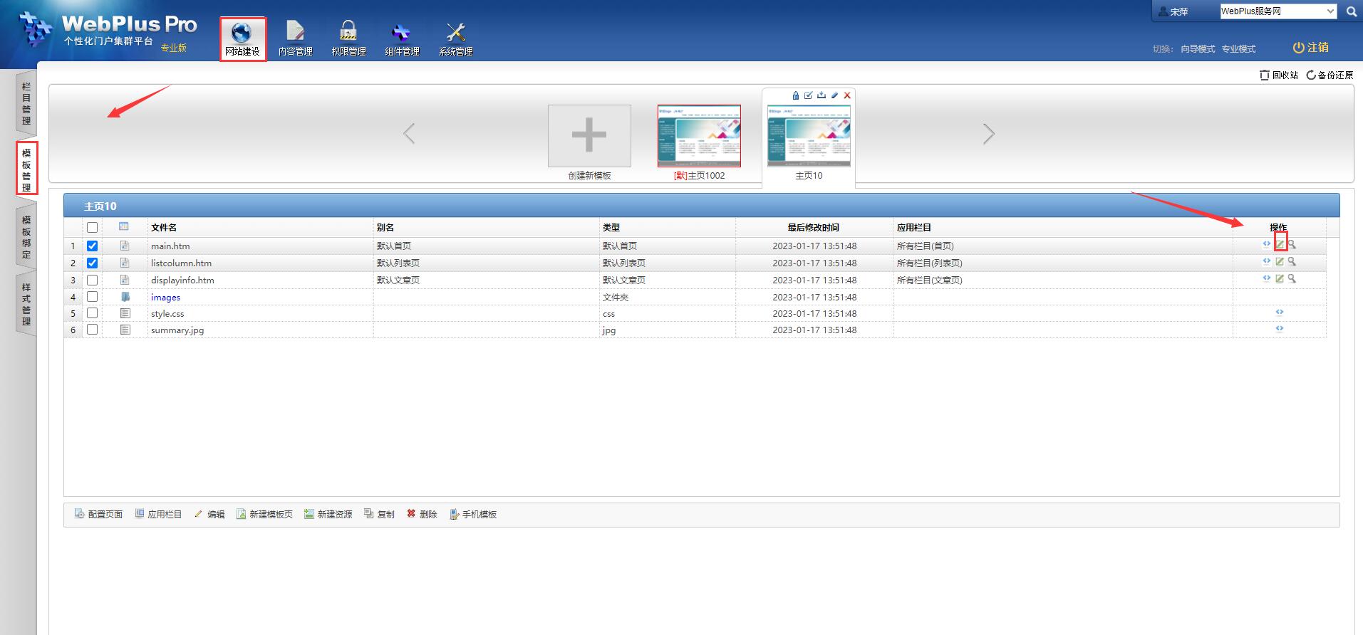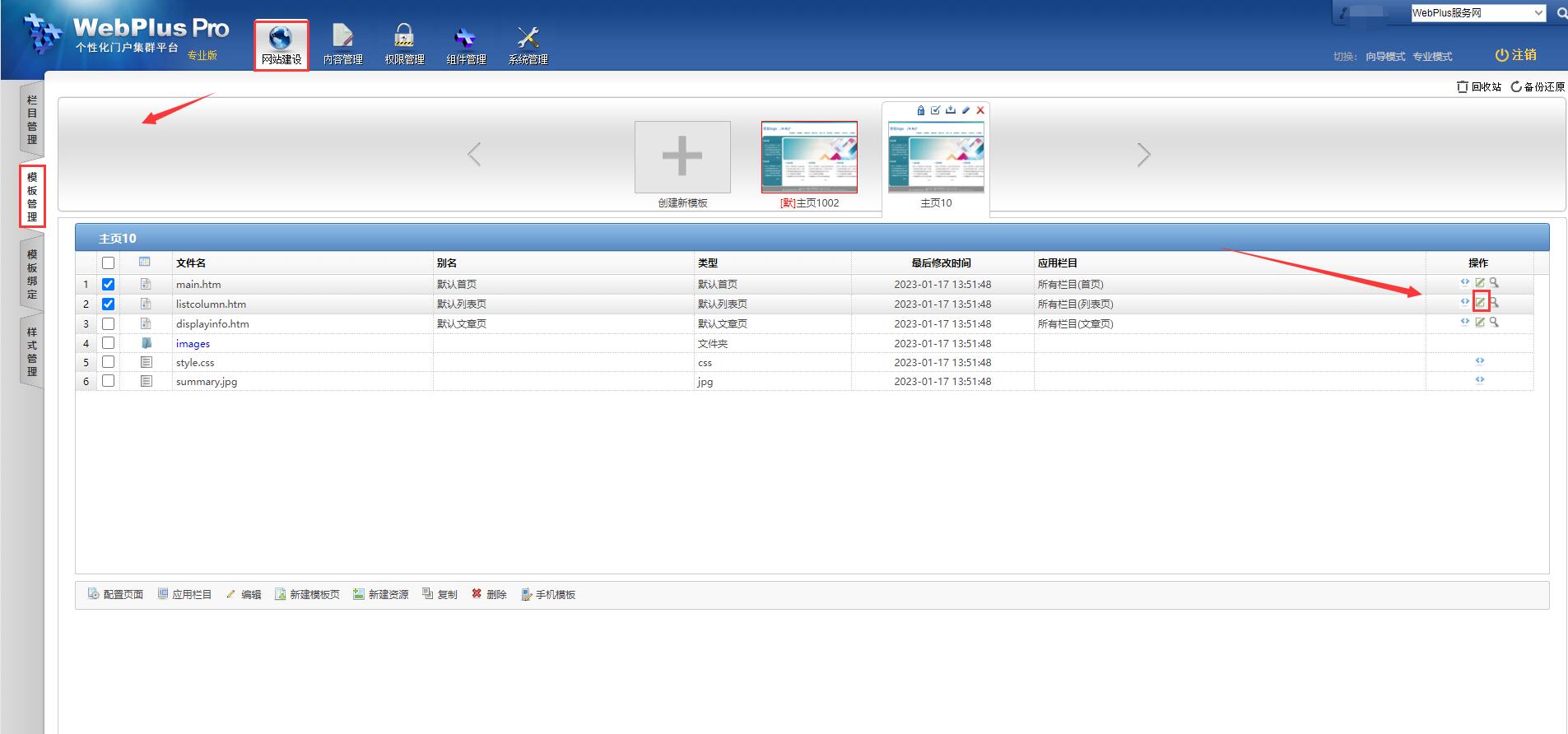 【网站建设】-【模板管理】,点击main.htm页面的“配置”按钮