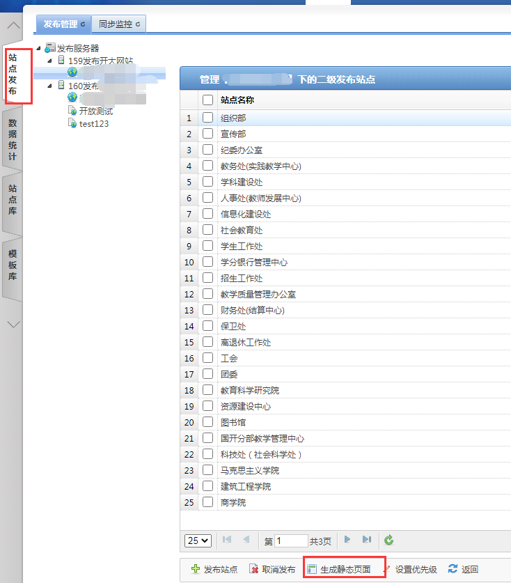 确认该站点是否点击生成了静态页面,并且同步监控下正常产生队列