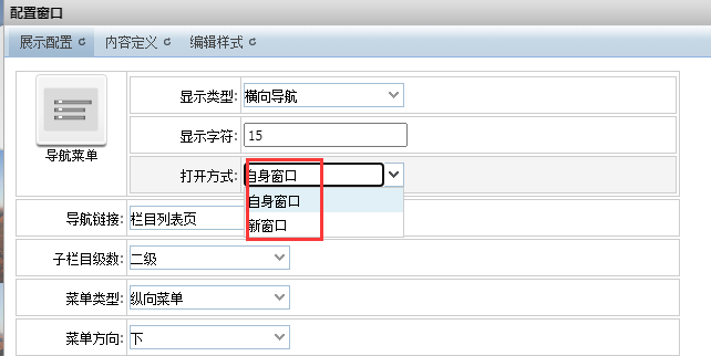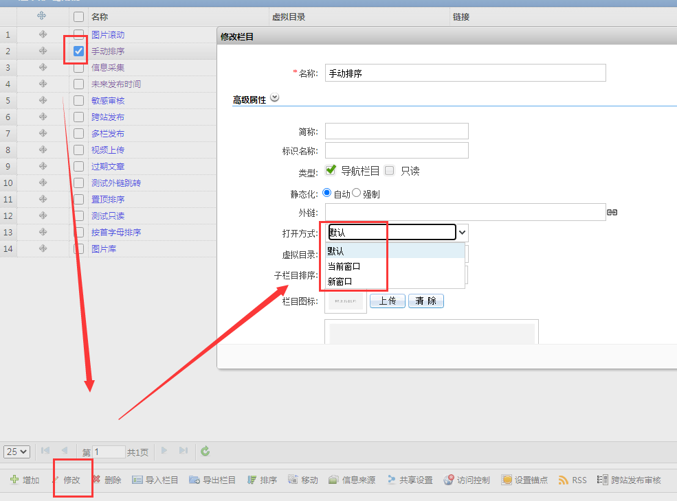 点击栏目管理,修改栏目属性,也可以设置打开方式