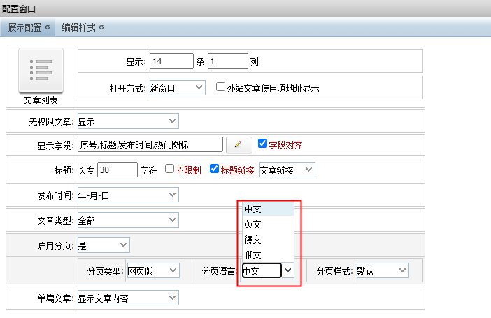 配置窗口可以修改分页语言