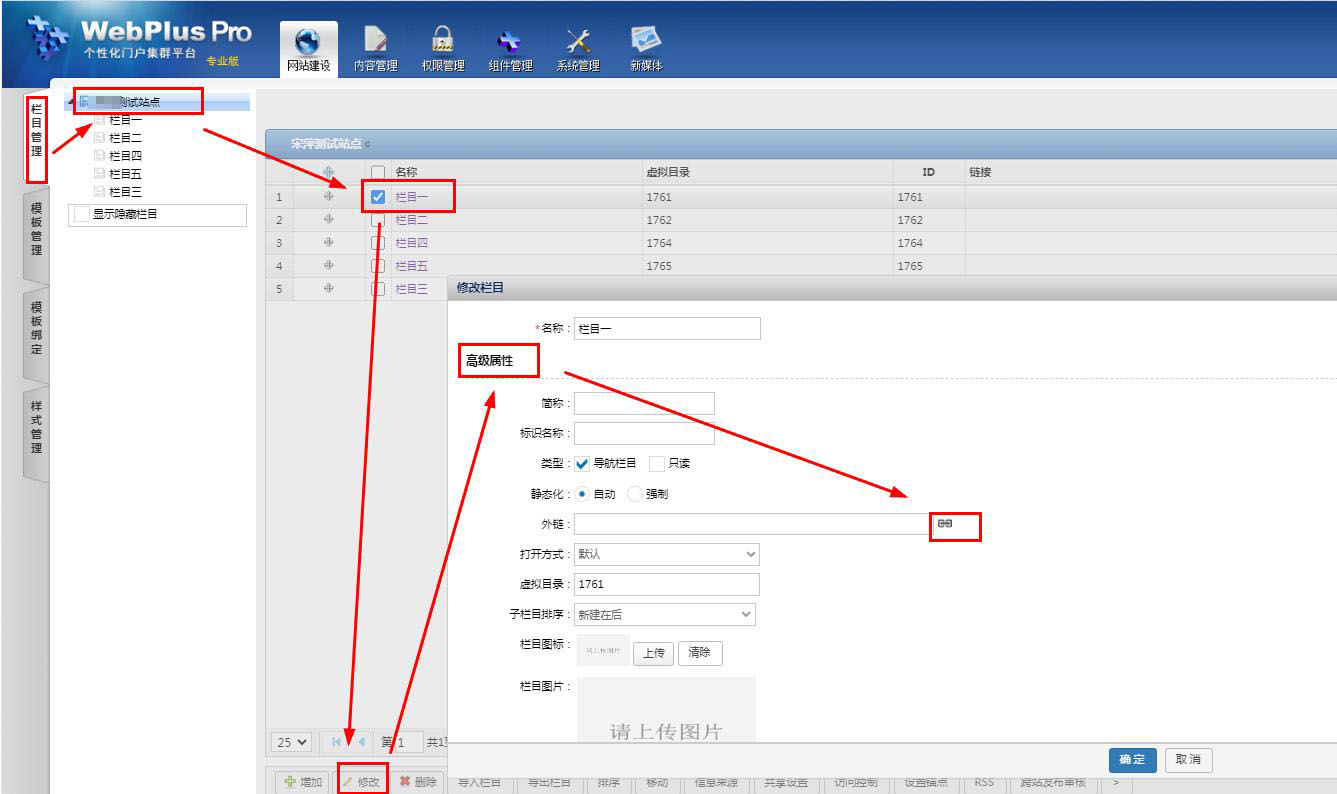 网站建设-栏目管理,点击文章所在栏目修改;选择高级属性,在弹出的对话框中,选择外链最右侧的按钮;如图所示: