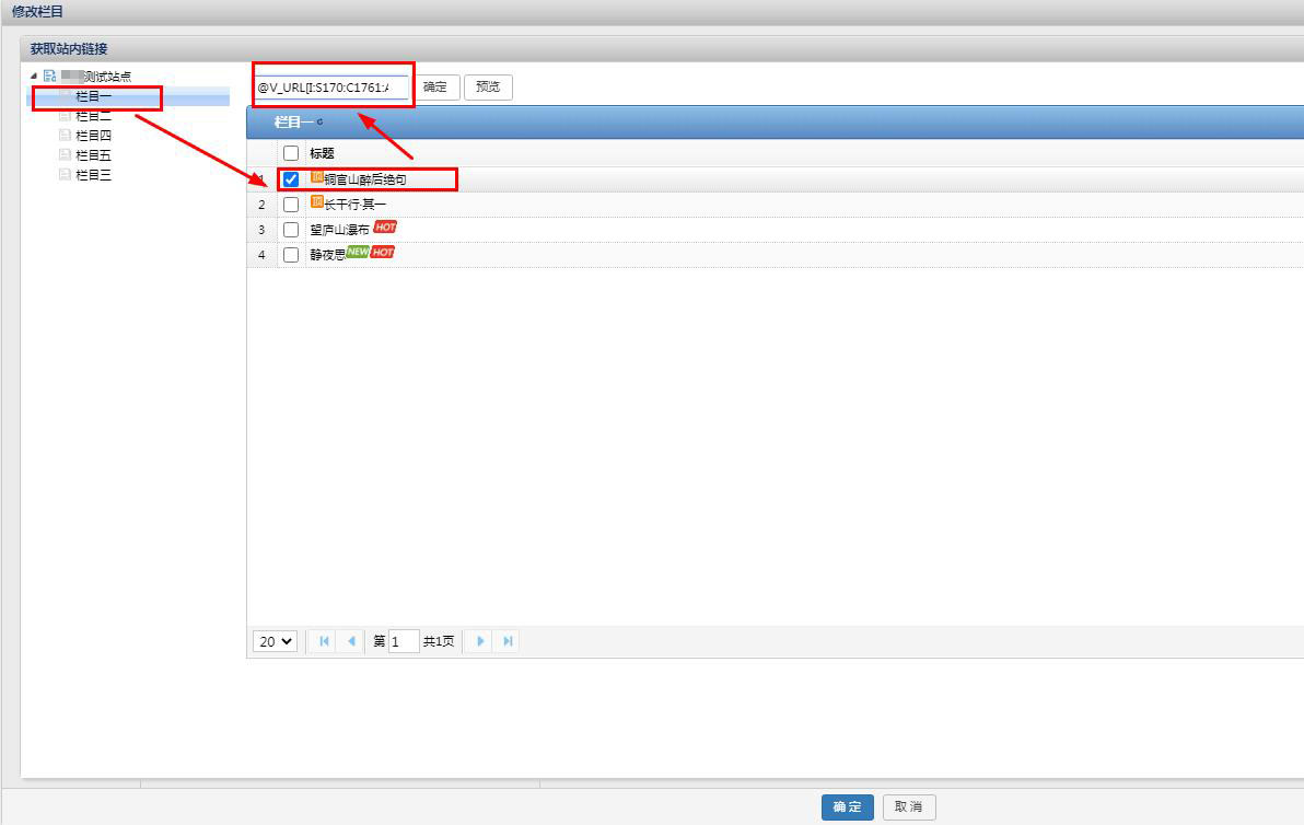 在弹出的对话框中,选择你要获取文章所在的栏目,选择文章,就可以获取到此文章的地址了。