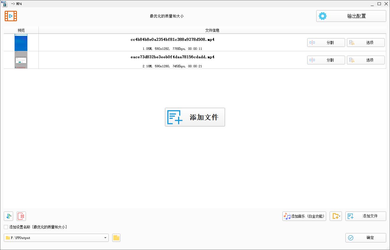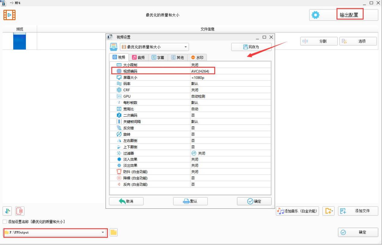 步骤四:完成视频编辑后,点击右上方的“输出配置”按钮,将视频的编码格式设置为AVC(H264),也可以根据需求修改其他设置。左下角可以修改文件存放位置,完成设置后点击右下角的“确定”按钮。