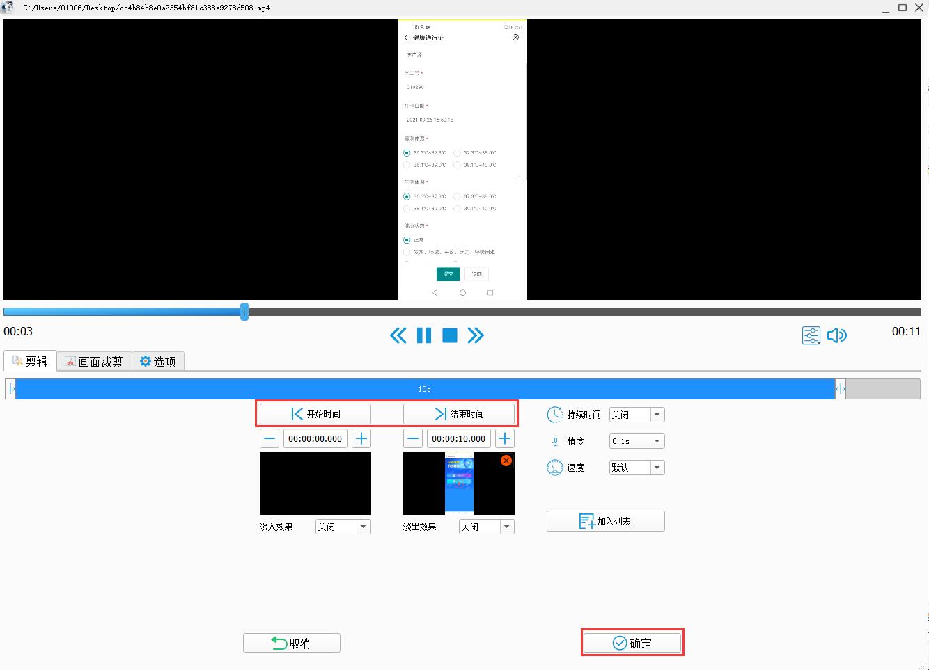 步骤三:如需视频剪辑,可在视频添加后,通过视频下方的“剪辑”功能对视频进行裁剪。可以根据视频进度点击【开始时间】设置视频起点,点击【结束时间】设置视频终点,也可以自己手动设置起点、终点,最后点击【确定】键保存退出去。如果不需要修改时长可以跳过此步骤。