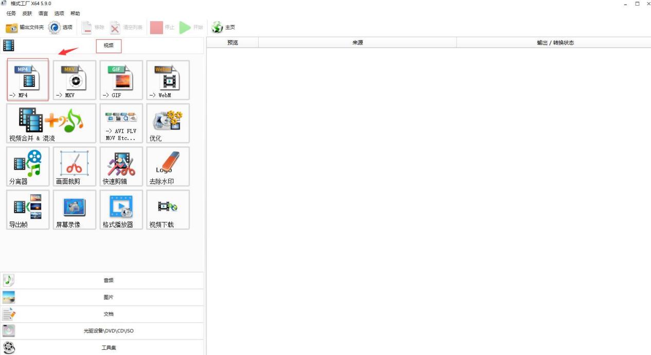 步骤一:下载安装格式工厂软件,打开软件,选择左侧“视频”栏中的“MP4”格式。这里是指目标文件类型,目标将视频转换成MP4。如下图: