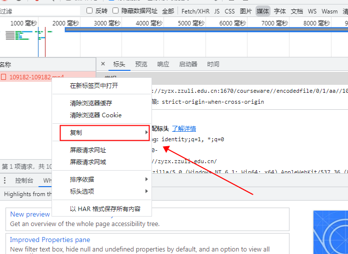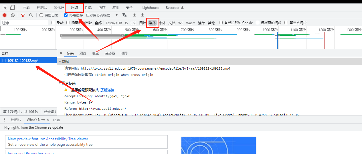 此时需要填写远程视频的源地址,源地址获取方式如下:打开远程视频网页,按键盘“F12”打开浏览器调试窗口,找到“网络”,选择“媒体”,找到目标.MP4文件;