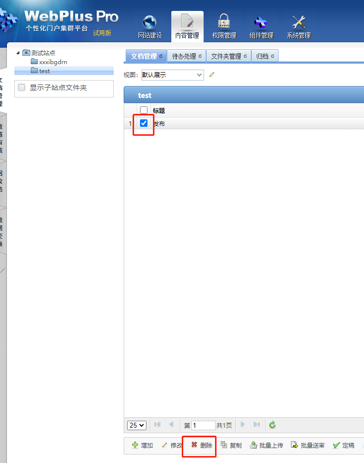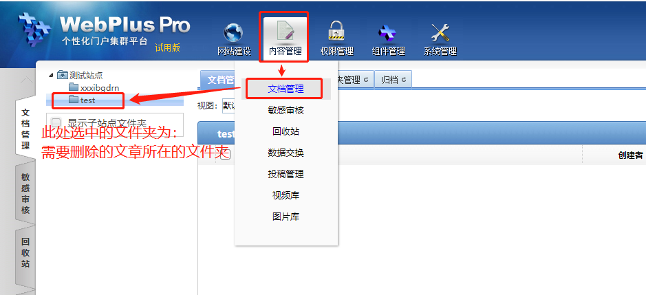 点击内容管理——文档管理,选中需要删除的文章所在的文件夹。