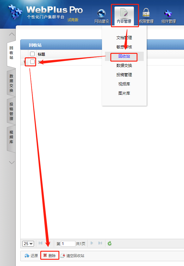 点击内容管理——回收站,勾选需要删除的文章,点击删除即可。