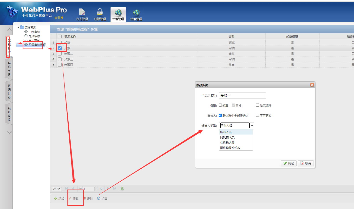 2:增加完成后,可以设置流程的相关属性;点击刚才建立流程的名称,可以选择对应的步骤,进行设置;如:左侧选择“四级审核流程”,右侧选择:步骤一,点击“修改”按钮,可以设置:审核人类型为“同机构人员”或者其他属性(根据自身需求来设置)。