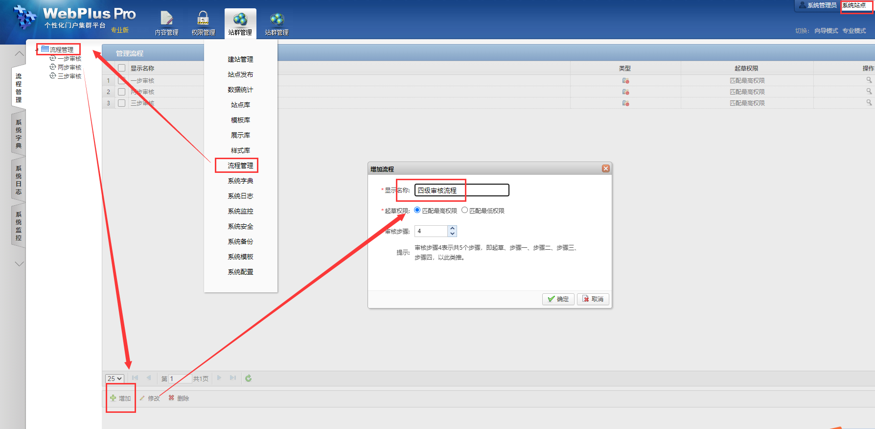 1:系统站点-站群管理-流程管理,选择增加需要的流程名称;如图所示: