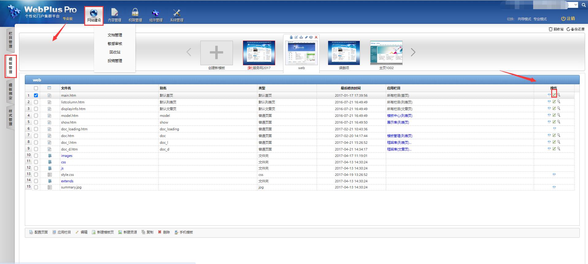 【网站建设】-【模板管理】,点击需要设置的模板页,点击“配置”:
