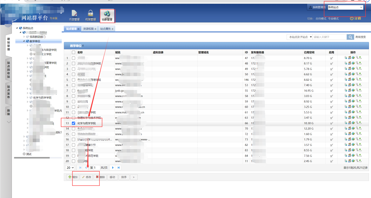 首先需要系统管理员登录系统站点下修改,系统站点下点击【站群管理】-【建站管理】,选项需要修改空间大小的站点,点下面的“修改”按钮