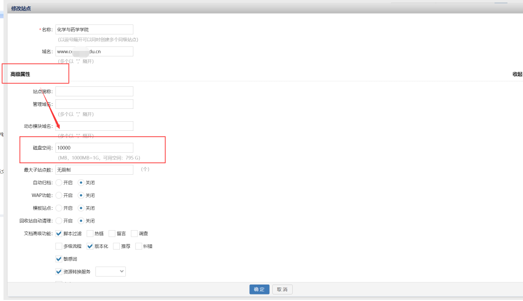 展开“高级属性”,修改站点属性,把磁盘空间的容量修改一下即可,给对应网站磁盘空间分配多少,由用户自行确认
