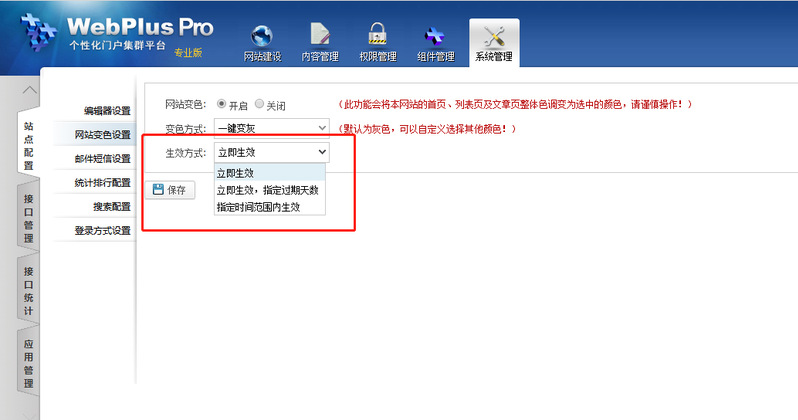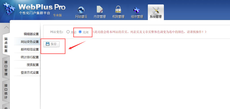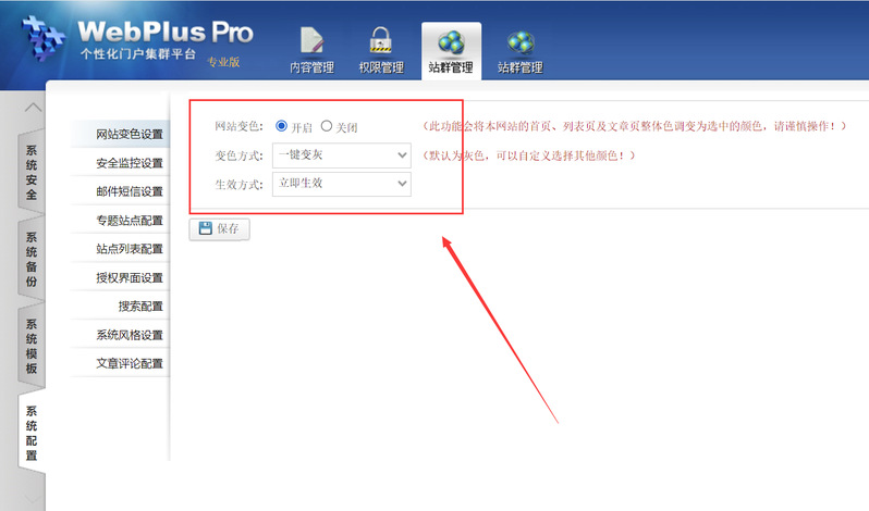 打开【站群管理】-【系统配置】-【网站变色设置】配置页面;