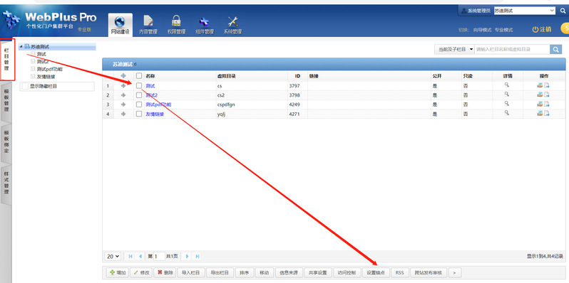 点击【栏目管理】,选择对应栏目,点击下方“设置锚点” (注:同时勾选多个锚点可以批量设置)