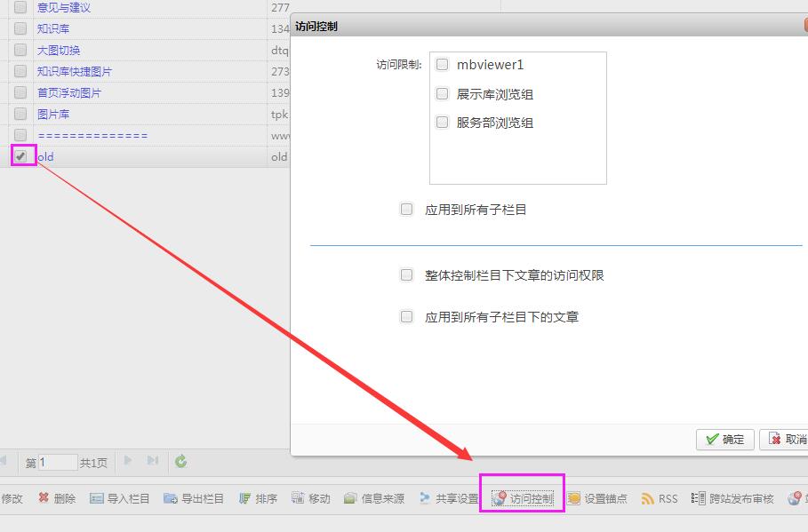 。返回【工具箱】-【栏目管理】,选择访问控制,在弹出的对话框里面,选择之前建立的浏览组的名称即可。