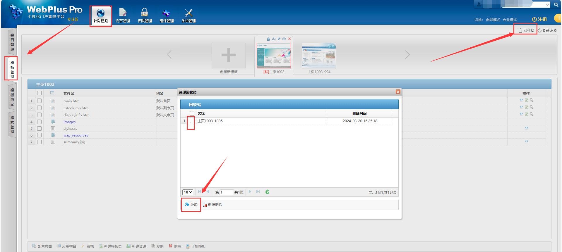【网站建设】-【模板管理】,右上角有个“回收站”选项,打开回收站,找到被删除的模板,选中后点下面的“还原”按钮;如图所示: