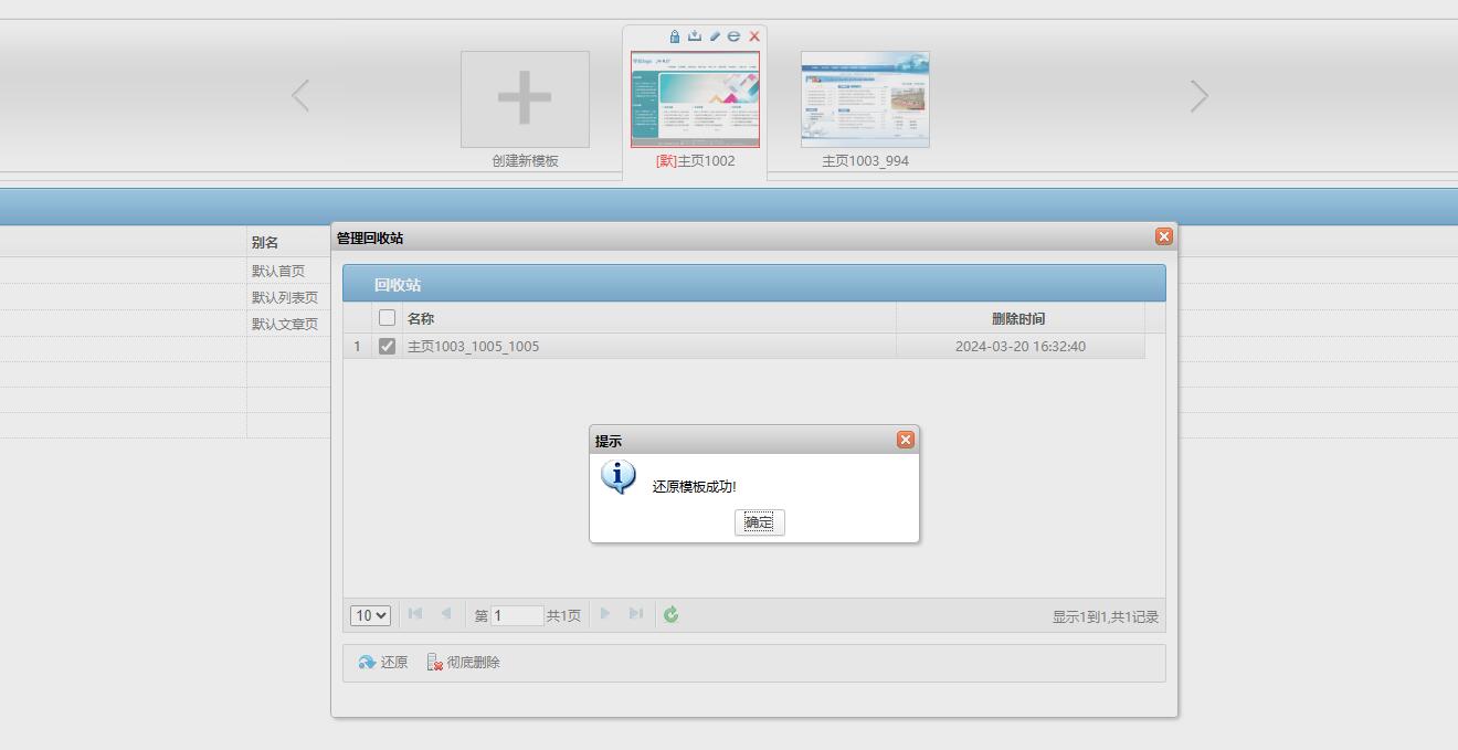点击还原后会提示还原成功,再到【模板管理】下就可以看到刚才还原的模板。