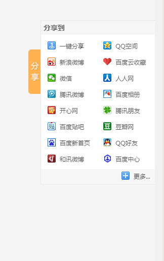 <div class="bdsharebuttonbox" data-tag="share_1"> <a class="bds_mshare" data-cmd="mshare"></a> <a class="bds_qzone" data-cmd="qzone" href="#"></a> <a class="bds_tsina" data-cmd="tsina"></a> <a class="bds_baidu" data-cmd="baidu"></a> <a class="bds_renren" data-cmd="renren"></a> <a class="bds_tqq" data-cmd="tqq"></a> <a class="bds_more" data-cmd="more">更多</a> <a class="bds_count" data-cmd="count"></a> </div>